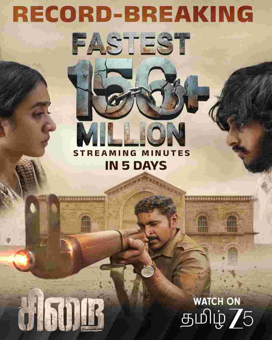 இந்தியாவின் முன்னணி ஓடிடி தளமான ZEE5 இல் சமீபத்தில் வெளியான “சிறை” திரைப்படம், மிகக் குறுகிய காலத்திலேயே 156 மில்லியன் பார்வை நிமிடங்களை கடந்து புதிய சாதனையை படைத்துள்ளது. திரையரங்குகளில் வெளியாகி பெரும் வெற்றியைக் குவித்த பிறகு, ஓடிடி தளத்தில் வெளியான இப்படம், உண்மைச் சம்பவத்தை அடிப்படையாக கொண்ட அதன் ஆழமான கதைக்களம், வலுவான நடிப்புகள் மற்றும் உணர்வுபூர்வமான உருவாக்கம் காரணமாக ரசிகர்கள் மத்தியில் பெரும் வரவேற்பைப் பெற்றுள்ளது.