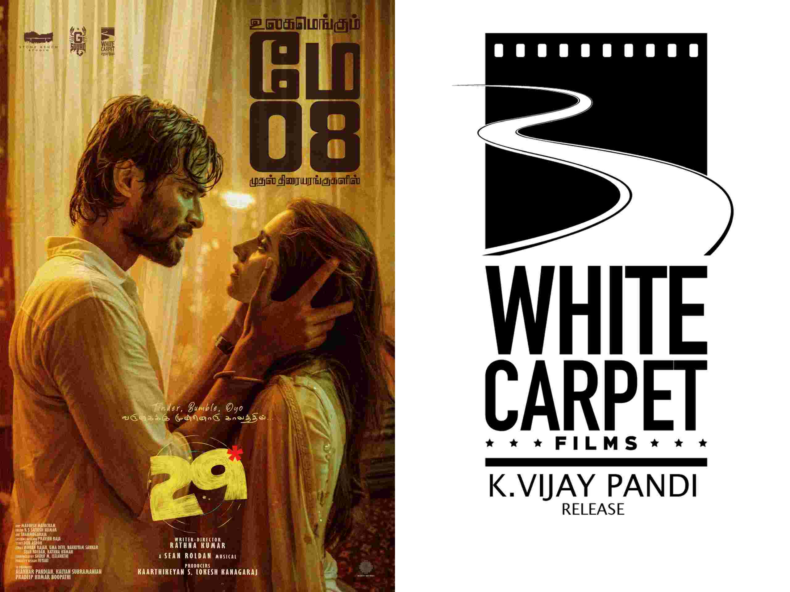 தமிழ் சினிமாவில் தொடர்ந்து வித்தியாசமான கதைகளையும் தரமான தயாரிப்புகளையும் வழங்கி முன்னேறி வரும் தயாரிப்பு நிறுவனமாக White Carpet Films திகழ்கிறது. குறுகிய காலத்திலேயே தனித்துவமான படைப்புகளால் கவனம் ஈர்த்துள்ள இந்த நிறுவனம், தற்போது தனது அடுத்த முக்கிய வெளியீடாக “29” திரைப்படத்தை ரசிகர்களுக்கு கொண்டு வரத் தயாராகியுள்ளது. இத்திரைப்படம் வரும் மே 8 2026 ஆம் தேதி தமிழகமெங்கும் வெளியிடப்படவுள்ளது. இந்த வெளியீட்டை இந்நிறுவனம் சார்பில் K விஜய் பாண்டி முன்னின்று மேற்கொள்கிறார்.